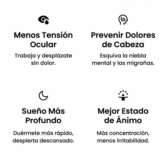 Los filtros de lentes rojas bloquean la luz de onda corta que emiten tus dispositivos, reduciendo la fatiga visual, favoreciendo un sueño más profundo y manteniendo tu energía alta.